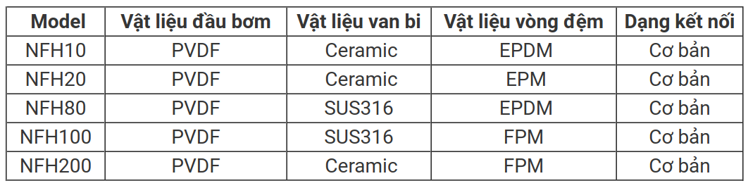 Máy bơm định lượng Nikkiso là dòng máy bơm nổi tiếng của Nhật Bản, được sản xuất và lắp ráp tại Đài Loan. Đây là dòng máy bơm với lưu lượng chính xác cao. Máy bơm định lượng Nikkiso 10 PVDF Máy bơm định lượng hóa chất xử lý nước thải NFH 10 có kích thước nhỏ gọn, vật liệu nhựa, màng teflon bơm được hầu hết các loại hóa chất, ngoại trừ Polymer. Đây là dòng máy bơm với thể tích lưu lượng thấp, và máy có thể tự điều chỉnh lưu lượng bằng tay hoặc tự động. đặc biệt máy bơm có độ chính xác cao. Ngoài ra, bơm định lượng NFH còn có những mã như sau: Vì mỗi máy bơm định lượng NFH điều có mã khác nhau chuyên dùng để bơm hóa chất, do đó để lựa chọn đúng với hóa chất cần bơm bạn cần xác định chất bơm là gì? hoặc liên hệ: 0909.115.704 Mr.Hường để tư vấn kỹ hơn. THÔNG SỐ SẢN PHẨM – Điện áp: 220V – Lưu lượng lớn nhất: 6(L/h) – Áp suất lớn nhất: 7(Kg/cm2) – Công suất: 22W Ứng dụng của máy: - Bơm các loại chất vô cơ (chất bán dẫn, kim loại, mạch điện, đá và quặng ...) - Bơm hóa chất công nghiệp (dệt nhuộm, thuốc tây,công nghiệp luyện kim, công nghiệp quặng...) - Bơm trong ngành công nghệ thực phẩm (nước chấm, thức uống, đường, bia, amylum...) - Ứng dụng trong các phòng thí nghiệm. - Bơm hóa chất xử lý nước thải. - Bơm hóa chất vào hồ bơi. Spro là địa chỉ nhập khẩu máy bơm định lượng chính hãng từ Đài Loan 100%, có giấy chứng nhận CO/CQ đầy đủ, bảo hành 12 tháng, linh kiện phụ kiện đầy đủ, bảo hành và giao hàng tận nơi trên toàn quốc. Với nhiều năm kinh nghiệm đảm bảo sẽ tư vấn đến cho quý khách dòng máy bơm tốt nhất. Spro đảm bảo cung cấp đầy đủ lưu lượng và công suất máy đảm bảo phục vụ mọi nhu cầu của quý khách. Ưu đãi khi mua hàng tại SPRO: Bảo hành: 12 tháng, trong thời gian bảo hành, nếu có bất kỳ sự cố, hỏng hóc, sẽ có nhân viên đến tận nhà sửa chữa Miễn phí giao hàng tại HCM Hỗ trợ phí giao hàng 40km cho khách hàng ở Tỉnh. Giao hàng và lắp đặt tận nơi trên toàn quốc. Có đầy đủ linh phụ kiện thay thế Luôn hỗ trợ sửa chữa sau khi hết hạn bảo hành SPRO.VN CHUYÊN CUNG CẤP THIẾT BỊ CÔNG NGHIỆP VÀ DÂN DỤNG Liên hệ để được tư vấn và báo giá máy bơm định lượng: TP. Hồ Chí Minh: 167 - 169 Bình Lợi, Phường 13, Quận Bình Thạnh Hotline: 02835.534.298 (7h30 - 17h) Mr.Phú: 0986.954.423 Ms.Hường: 0909.115.704 Ms.Thanh: 0965.570.643 Ms.Ni: 0962.073.945 Hà Nội: Số 47, Liền kề 26, Khu đô thị Văn Phú, Quận Hà Đông Hotline: 0247.1022.233 (7h30 - 17h) Mr.Tàu: 0962.215.324 Mr. Công Anh: 0931.148.004 Mr. Cương: 0865.770.643