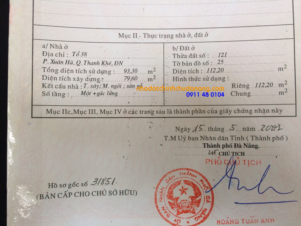 Gia đình cần vốn kinh doanh, nên bán nhà hai mặt tiền trung tâm Đà Nẵng cho người mua nhà kinh doanh. Vị trí và Tiện ích xung quanh căn nhà: Nhà 2 mặt tiền nằm trên đường Lê Quang Sung, thuộc quận Thanh Khê (giáp ranh với quận Hải Châu), Tp Đà Nẵng. + 5 phút để ra sân bay Đà Nẵng. + 6 phút để đến Ga tàu hỏa Đà Nẵng. + 3 phút đến công viên trung tâm Đà Nẵng. (Công viên 2/9) + 2 phút để ra biển Nguyễn Tất Thành, bờ biển có dự án Sunrise bay nổi tiếng Việt Nam. + 3 phút để đến siêu thị điện máy Nguyễn Kim Đà Nẵng - cũng là khu thương mại, chợ lớn nhất Đà Nẵng. Đây là căn nhà có vị trí đắc địa, dân cư đông đúc, thu nhập cao tại trung tâm thành phố Đà Nẵng. Rất thuận lợi cho việc mở công ty, spa, thẩm mỹ viện, nhà nghỉ, cho thuê… Hệ thống giao thông xung quanh nhà: Đường trước nhà: đường oto - 7m5, lề 3m. Đường kiệt (hẻm) bên hông nhà: 3m. Nhà cách đường Lê Độ là 125m (đường Lê Độ là tuyến đường huyết mạch nối biển Nguyễn Tất Thành với đường vào sân bay - đường Nguyễn Tri Phương. Đây cũng là tuyến đường giao với hầm chui Điện Biển Phủ - nối bến xe với trung tâm thành phố). Thông tin chi tiết ngôi nhà cần bán: Ngôi nhà có 2 mặt tiền. Một mặt hướng Bắc lệch Tây, một mặt hướng Đông lệch Bắc Nở hậu theo hai hướng - tùy theo gia chủ chọn hướng chính cho nhà. Diện tích đất: 112m2. Diện tích sử dụng: 93,3m2 Số tầng: 3 (2 mê) Kết cấu: nhà bê tông kiên cố (xây để ở lâu dài nên làm rất chắc chắn, chưa thể hiện tài sản trên sổ). Số phòng nhà chính: 2 phòng ngủ, 2 nhà vệ sinh, bếp, 3 sân vường, 1 phòng kho lớn trên sân thượng, phòng thờ, phòng khách. Tiện ích phụ: 2 phòng mặt tiền đường Lê Quang Sung đang cho thuê kinh doanh (Giá hiện tại 3 triệu/ căn). Giá bán chính chủ: 9,7 tỷ. Liên hệ để gặp chính chủ. Trương Văn Chư Chuyên gia tư vấn, môi giới nhà đất Đà Nẵng Nhận ký gửi nhà đất tại Đà Nẵng. Fone/Imess/Zalo/Viber: 0911480104 Vườn phía trước tầng 2 Đường trước nhà Đường trước nhà đỗ được oto Vườn tầng trệt