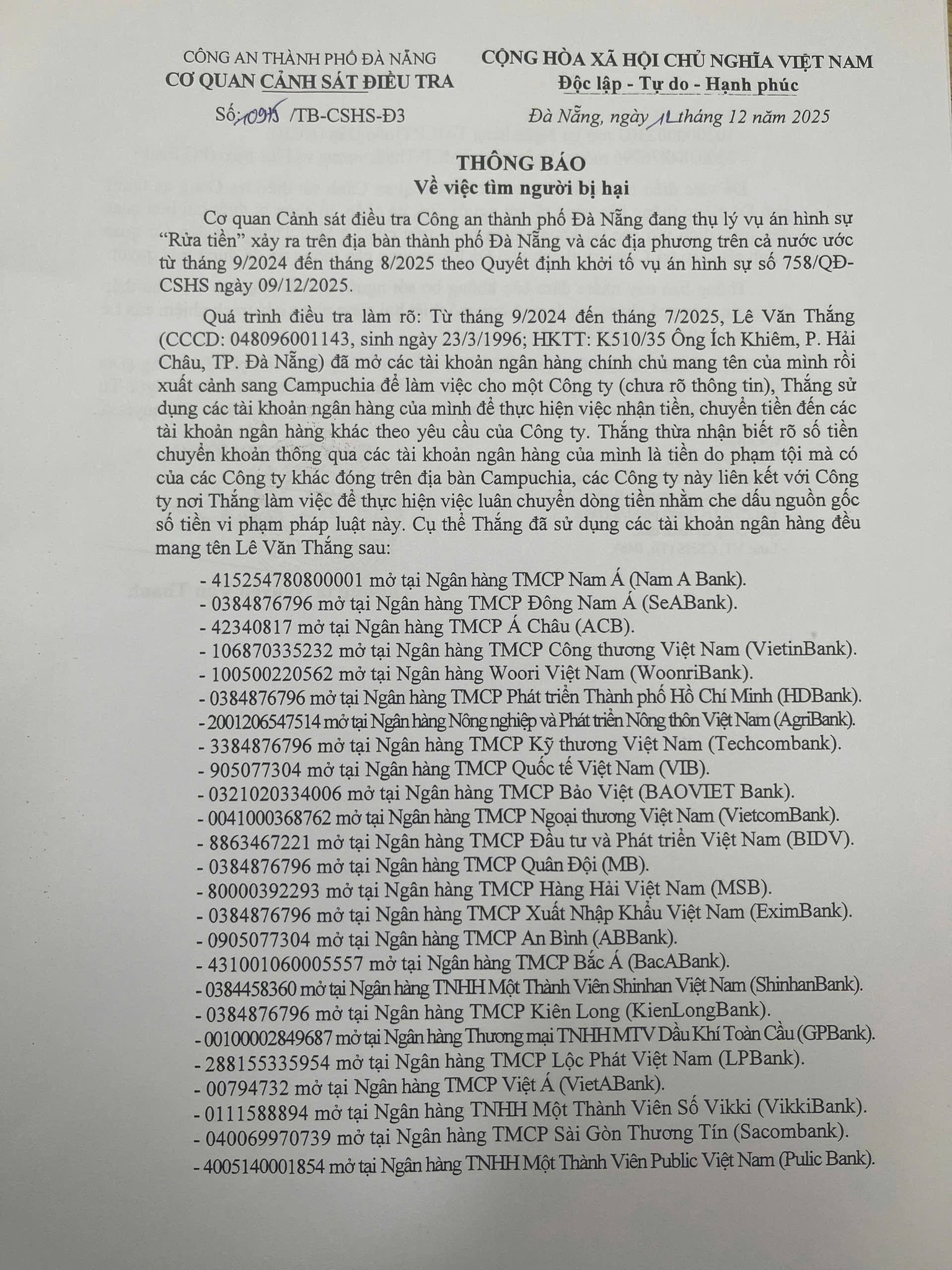 [K14] Công an tìm người liên quan đến 27 số tài khoản ngân hàng tên Lê Văn Thắng