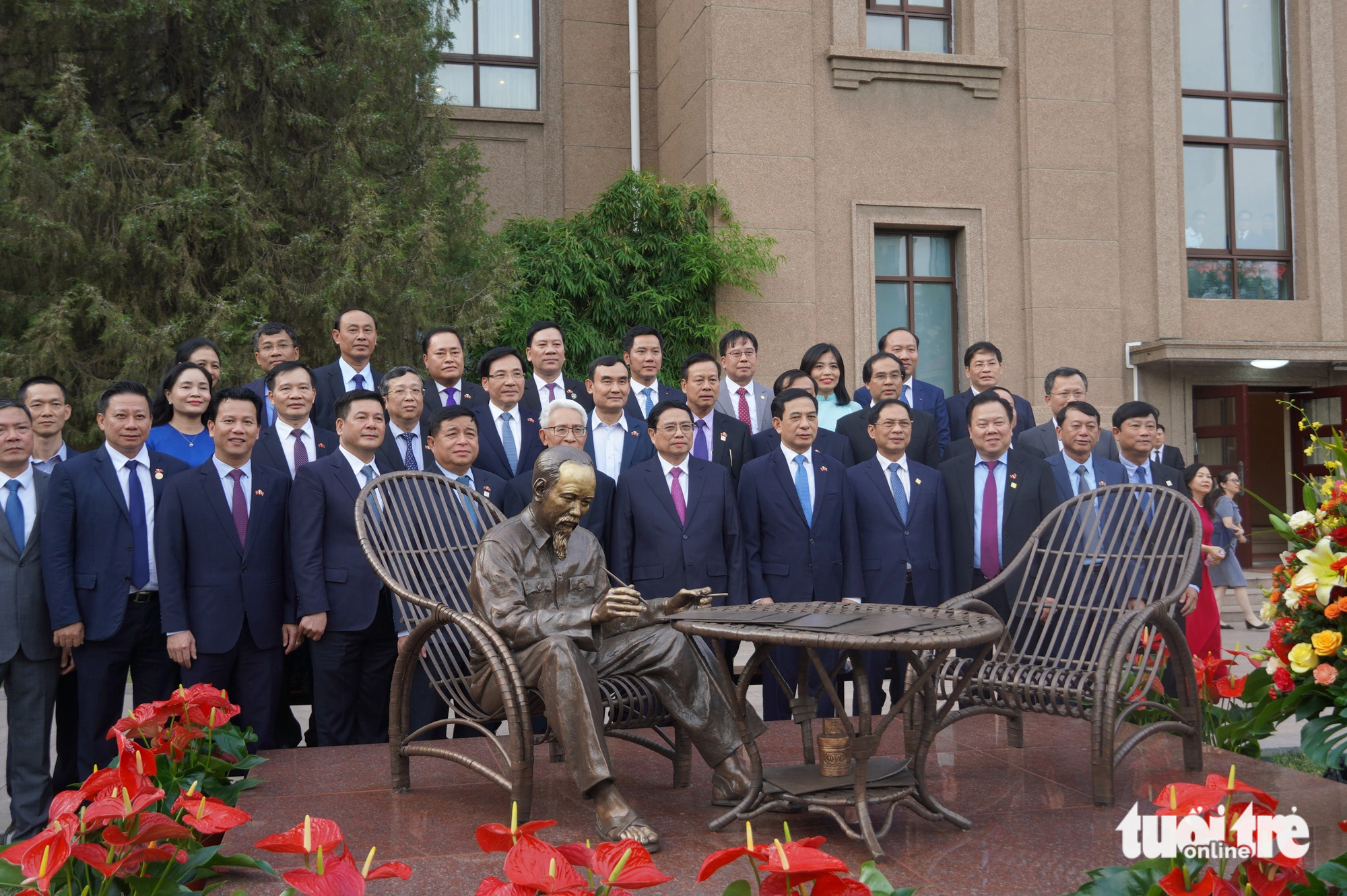 Thủ tướng dâng hoa và chụp ảnh kỷ niệm tại tượng đài Chủ tịch Hồ Chí Minh trong khuôn viên Đại sứ quán Việt Nam - Ảnh: NGỌC AN