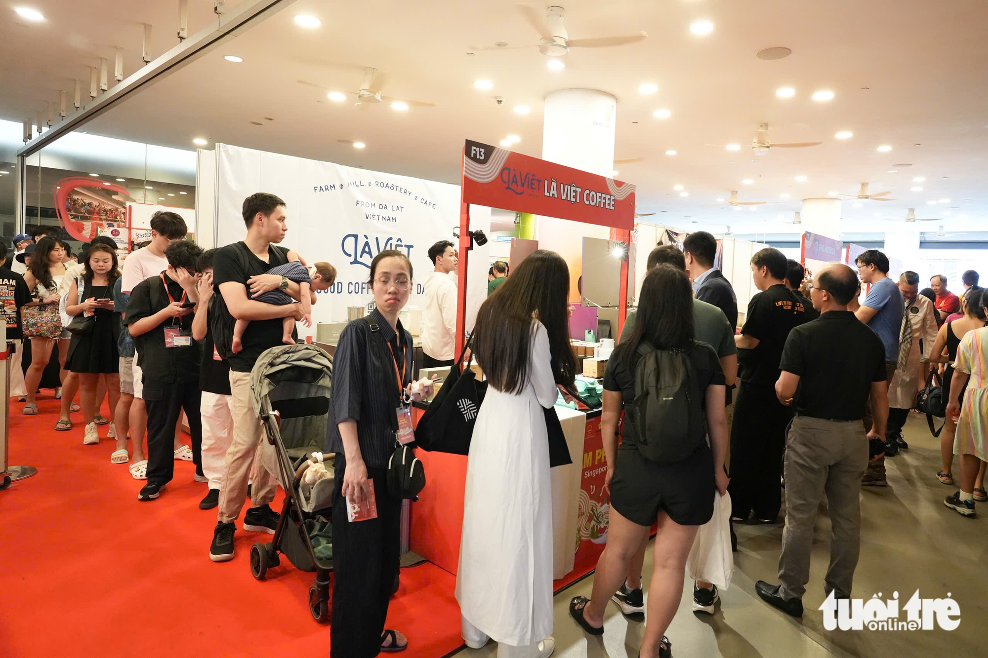 Gian hàng cà phê Là Việt sáng nay đón lượng khách khủng. Anh Trần Nhật Quang, đại diện Là Việt coffee Lâm Đồng, "hào hứng khi cà phê Việt lại được người dân ở đây đón nhận nồng nhiệt như vậy".
